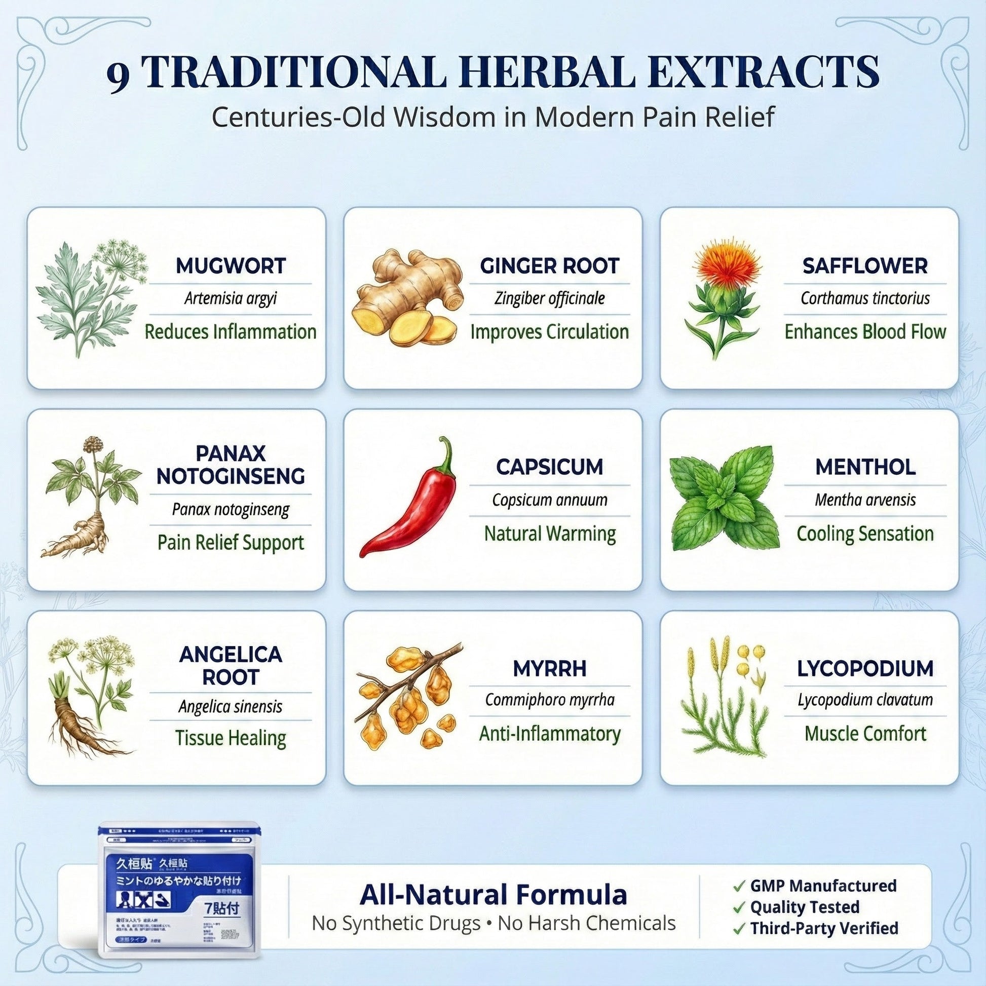 The patch uses time-tested herbal ingredients and modern heat-sensitive technology to deliver soothing relief directly to the source of pain. It works by gently increasing circulation and calming inflammation in joints — naturally and without harsh chemicals.